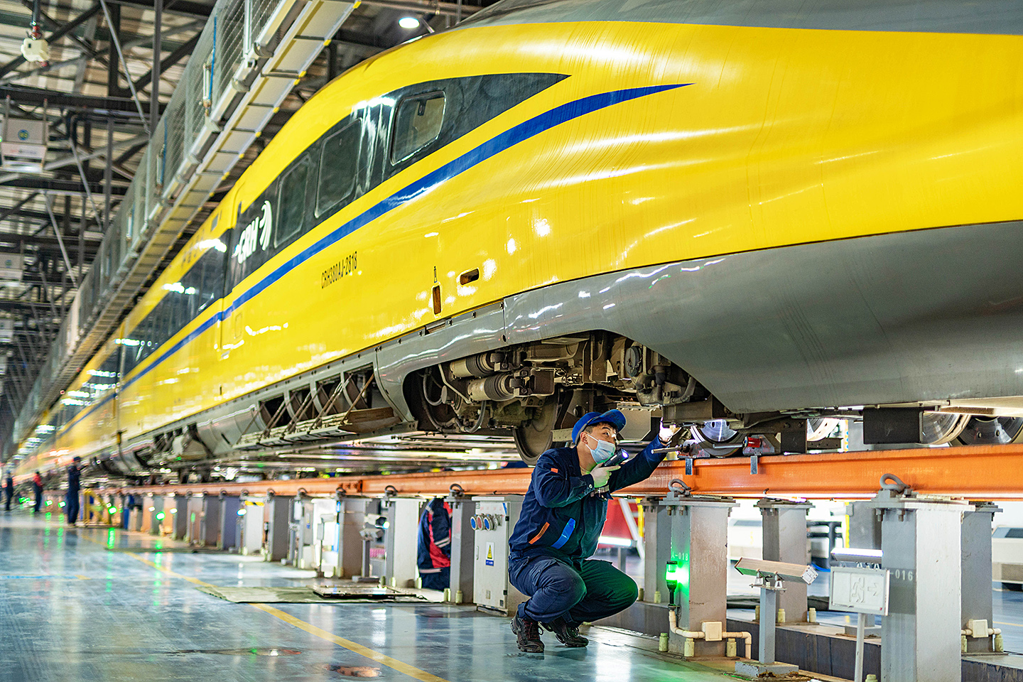2月7日,中國鐵路鄭州局集團(tuán)有限公司鄭州動(dòng)車段動(dòng)車組機(jī)械師對(duì)綜合檢測列車轉(zhuǎn)向架狀態(tài)進(jìn)行檢查