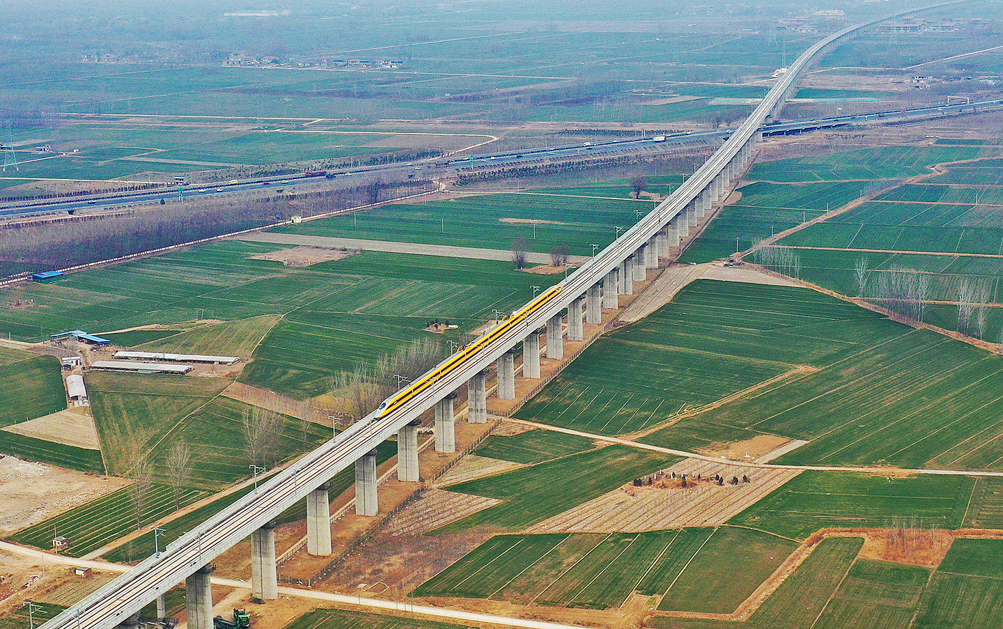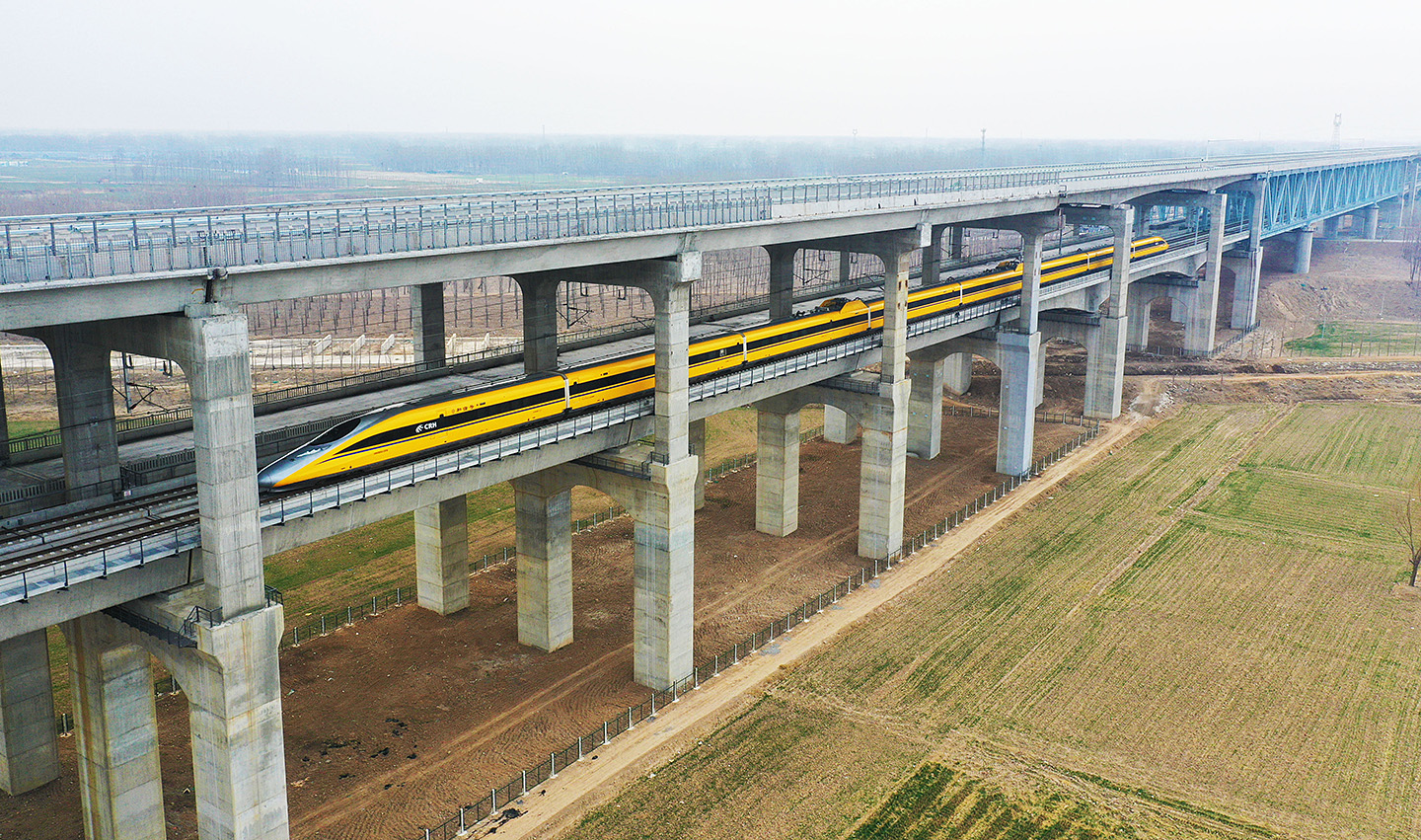 2月8日,綜合檢測列車行駛在濟(jì)鄭高鐵濮陽至鄭州段區(qū)段對(duì)線路設(shè)備狀態(tài)進(jìn)行檢測(無人機(jī)照片)