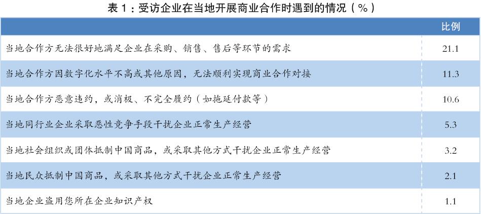 在企業(yè)面臨的商業(yè)誠(chéng)信問(wèn)題方面,超兩成受訪企業(yè)表示“當(dāng)?shù)睾献鞣綗o(wú)法很好地滿(mǎn)足企業(yè)在采購(gòu)、銷(xiāo)售、售后等環(huán)節(jié)的需求”,這也是受訪企業(yè)面臨的最主要挑戰(zhàn)。另外分別有約一成企業(yè)面臨著受當(dāng)?shù)丶夹g(shù)條件限制無(wú)法與當(dāng)?shù)睾献鞣巾樌麑?shí)現(xiàn)商業(yè)對(duì)接的困境,或是受到當(dāng)?shù)睾献鞣綈阂膺`約、消極履約行為的掣肘。(見(jiàn)表1)