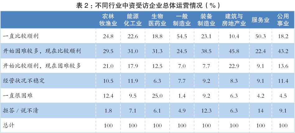 研究團(tuán)隊(duì)將“一帶一路”沿線(xiàn)受訪中資企業(yè)的行業(yè)歸屬劃分為農(nóng)林牧漁業(yè)、能源化工業(yè)、生物醫(yī)藥業(yè)、一般制造業(yè)、裝備制造業(yè)、建筑與房地產(chǎn)業(yè)、服務(wù)業(yè)和公用事業(yè)八個(gè)行業(yè),旨在進(jìn)一步探究海外中資企業(yè)在不同行業(yè)的發(fā)展境遇,以更有針對(duì)性地為企業(yè)“走出去”出謀劃策。得出以下結(jié)論: