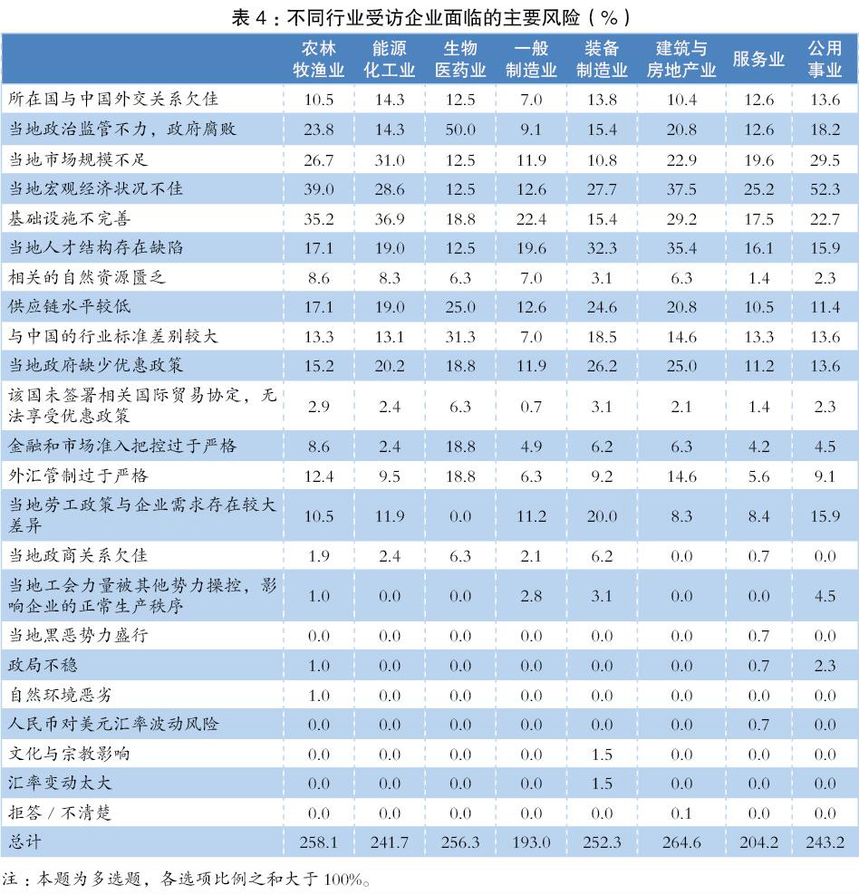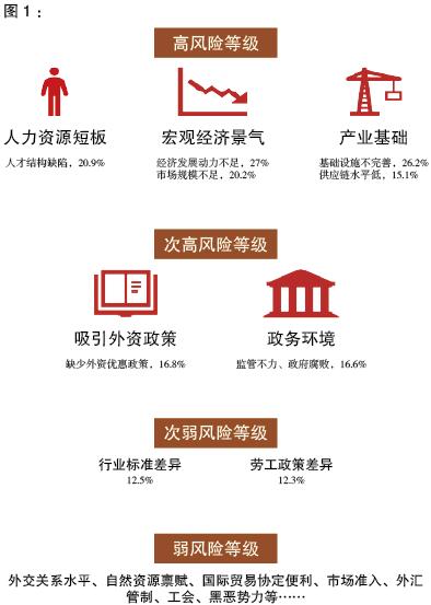 在調(diào)查問(wèn)卷中,研究人員列出了中國(guó)企業(yè)在“一帶一路”沿線(xiàn)國(guó)家投資運(yùn)行可能面臨的24項(xiàng)主要風(fēng)險(xiǎn),并根據(jù)受訪企業(yè)的應(yīng)答結(jié)果對(duì)風(fēng)險(xiǎn)的嚴(yán)重等級(jí)進(jìn)行了分類(lèi)。研究結(jié)果顯示,處在“高風(fēng)險(xiǎn)等級(jí)”的因素是人力資源短板、宏觀經(jīng)濟(jì)景氣不佳與產(chǎn)業(yè)基礎(chǔ)薄弱;處在“次高風(fēng)險(xiǎn)等級(jí)”的主要是政府與政策問(wèn)題,即政務(wù)環(huán)境、招商引資優(yōu)惠政策問(wèn)題。相對(duì)地,行業(yè)標(biāo)準(zhǔn)差異、勞工政策差異、自然資源稟賦、市場(chǎng)準(zhǔn)入、外匯管制、外交關(guān)系、社會(huì)環(huán)境等因素的風(fēng)險(xiǎn)系數(shù)較低。
