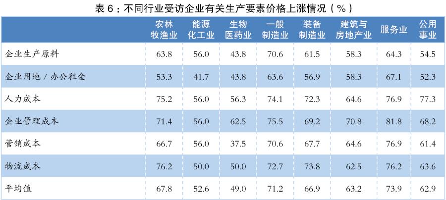 其六,各行業(yè)生產(chǎn)要素成本上漲壓力普遍較大,各生產(chǎn)要素價(jià)格上漲大多不超過(guò)30%。(見(jiàn)表6)