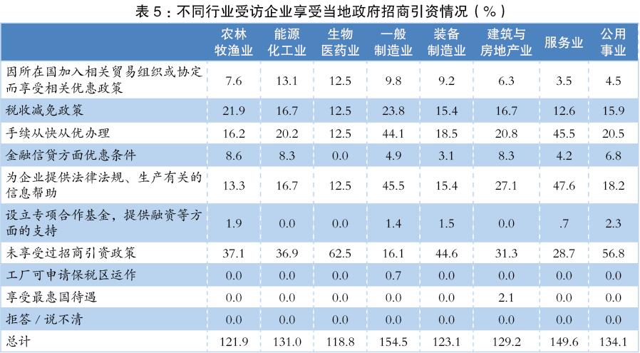 對(duì)于企業(yè)是否享有當(dāng)?shù)卣猩桃Y等優(yōu)惠,不同行業(yè)也存在著差異。(見(jiàn)表5)
