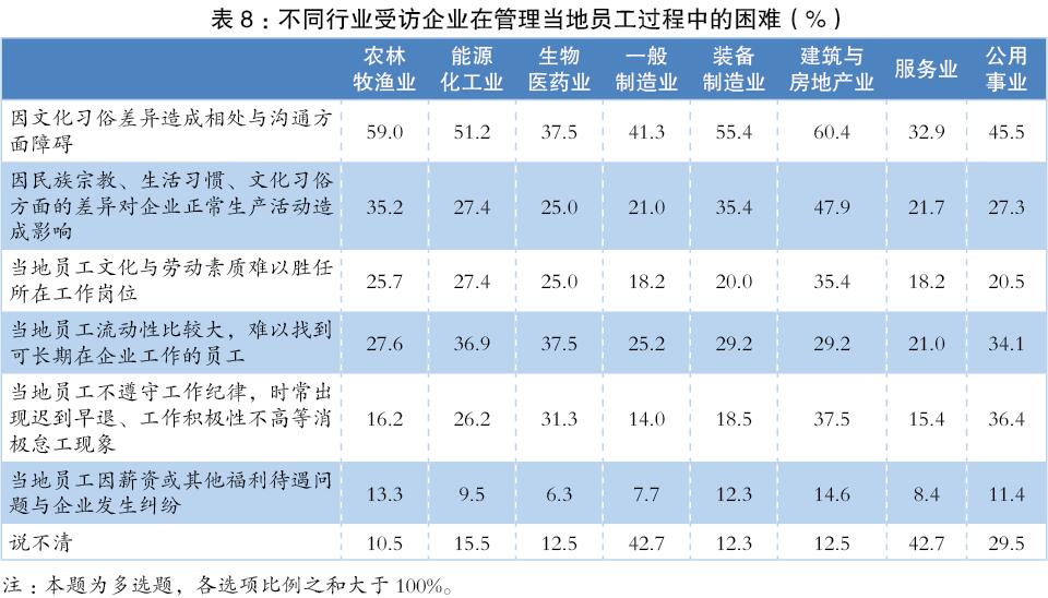 其八,跨文化溝通障礙與員工管理困難是各行業(yè)都面臨的難題,建筑與房地產(chǎn)業(yè)尤甚。(見(jiàn)表8)