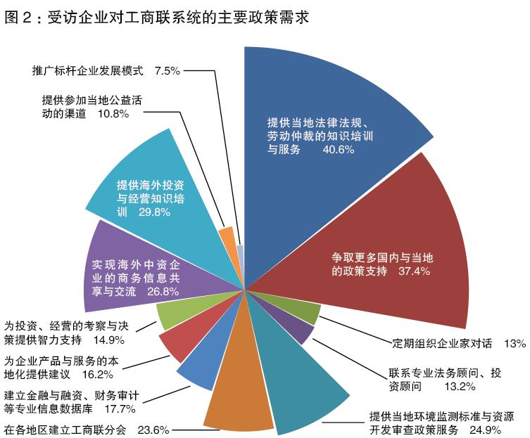 調(diào)查顯示,受訪企業(yè)對(duì)工商聯(lián)系統(tǒng)服務(wù)民營(yíng)企業(yè)“走出去”、助力民營(yíng)企業(yè)在“一帶一路”沿線(xiàn)國(guó)家發(fā)展的首要需求是“組織當(dāng)?shù)胤煞ㄒ?guī),尤其是勞動(dòng)仲裁糾紛方面的知識(shí)培訓(xùn)與專(zhuān)業(yè)化服務(wù)”(40.6%);排在第二位的需求是“與國(guó)內(nèi)和當(dāng)?shù)叵嚓P(guān)部門(mén)協(xié)調(diào),爭(zhēng)取更多政策支持”(37.4%);第三到五位的需求則分別是“海外投資與經(jīng)營(yíng)知識(shí)培訓(xùn)”(29.8%)、“搭建信息溝通平臺(tái),實(shí)現(xiàn)商務(wù)信息共享與投資經(jīng)驗(yàn)交流”(26.8%)和“在當(dāng)?shù)亟M織環(huán)境監(jiān)測(cè)標(biāo)準(zhǔn)、資源開(kāi)發(fā)審查政策專(zhuān)業(yè)化服務(wù)”(24.9%)。(見(jiàn)圖二)
