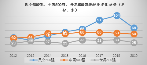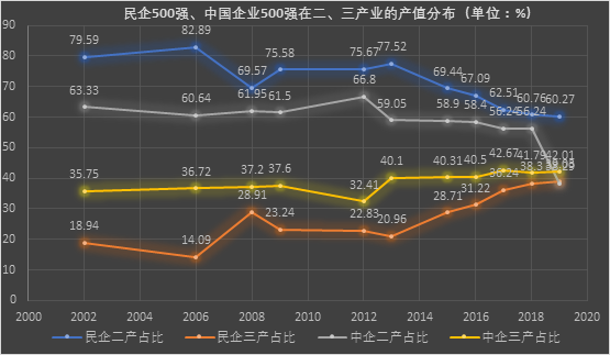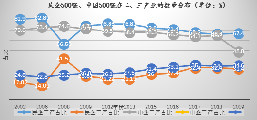 產(chǎn)業(yè)結構優(yōu)化升級是各國競爭與發(fā)展的主題和基礎。從2001年12月中國“入世”、2002年黨的十六大提出“兩個毫不動搖”,到2018-2019年中美爆發(fā)貿(mào)易摩擦、5G技術進入商用階段,是中國經(jīng)濟完成“重化工業(yè)”走向“高工業(yè)化”并趕超歐美國家的關鍵階段,也是民營經(jīng)濟產(chǎn)業(yè)轉型的攻堅時期。1995年《財富》雜志推出世界企業(yè)500強,2002年中企聯(lián)首次發(fā)布中國企業(yè)500強,2003年全國工商聯(lián)推出民營企業(yè)500強。分析比較民企500強的發(fā)展特征、短板難題和成長韌性,從企業(yè)微觀變量的角度尋找發(fā)展的目標和路徑,是當下民企走向高質(zhì)量發(fā)展的必需之策。