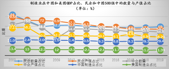 在工業(yè)化進程中,制造業(yè)起著決定性的支撐作用。1978-2005年,中國制造業(yè)產(chǎn)值由1475億元升至60118億元,年均增速15.1%;2006-2018年,由71212億元升至264820億元,年均增速11.3%。民營企業(yè)是制造業(yè)的主力,企業(yè)數(shù)量、營收總額、就業(yè)人數(shù)、研發(fā)投入都在50%以上,實現(xiàn)了從低端模仿到高端高技術產(chǎn)品的升級。
