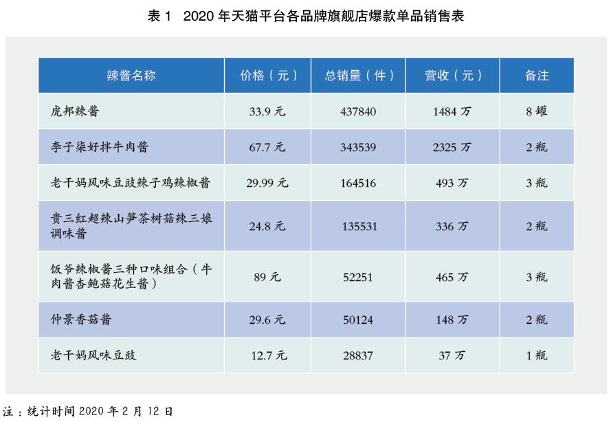 眾多品牌涌入辣醬行業(yè),“老干媽”面臨競爭對手合圍。當(dāng)下辣椒醬行業(yè)擁有400億元規(guī)模的市場,除“老干媽”一枝獨(dú)秀長期雄踞辣醬市場外,很難找到能與之抗衡的第二個品牌。辣醬市場仍呈現(xiàn)“只有第一沒有第二”的局面。伴隨新興網(wǎng)紅辣醬品牌的崛起,市場份額爭奪戰(zhàn)早已拉開序幕。2017年,被業(yè)界稱作“辣醬爆發(fā)元年”。歌唱明星、跨界巨頭、網(wǎng)紅、普通創(chuàng)業(yè)者等幾乎所有人都想從準(zhǔn)入門檻不高、消費(fèi)逐步分化、市場空間廣闊的辣醬行業(yè)分一塊蛋糕。目前國內(nèi)辣醬市場上極具發(fā)展?jié)摿η矣锌赡茉谖磥韺Α袄细蓩尅崩贬u霸主地位產(chǎn)生動搖的品牌主要有虎邦辣醬、貴三紅辣三娘調(diào)味醬、飯爺辣椒醬、仲景香菇醬以及2019年在國內(nèi)國際大受追捧的超級網(wǎng)紅李子柒代言的李子柒好拌牛肉醬,其中虎邦辣醬有著清晰的愿景,即填補(bǔ)辣醬行業(yè)第二的空缺,成長為在全國具有較強(qiáng)品牌認(rèn)知的企業(yè)。事實(shí)上近年來其在電商平臺及外賣市場有著不俗的表現(xiàn),2018年虎邦辣醬實(shí)現(xiàn)了上億罐的銷售量。同樣,在如今流量為王的時代,曾被央視點(diǎn)名的超級網(wǎng)紅李子柒旗下產(chǎn)品李子柒好拌牛肉醬發(fā)展勢頭迅猛(表1)。除此之外,全國各地大大小小數(shù)千家企業(yè)也躍躍欲試,但因“老干媽”常年深耕線下渠道,大部分競爭者選擇避其鋒芒通過電商平臺扎穩(wěn)根基。面對如雨后春筍般成長起來的新對手,如今的“老干媽”在辣醬行業(yè)真可謂百馬伐驥,危機(jī)四伏。